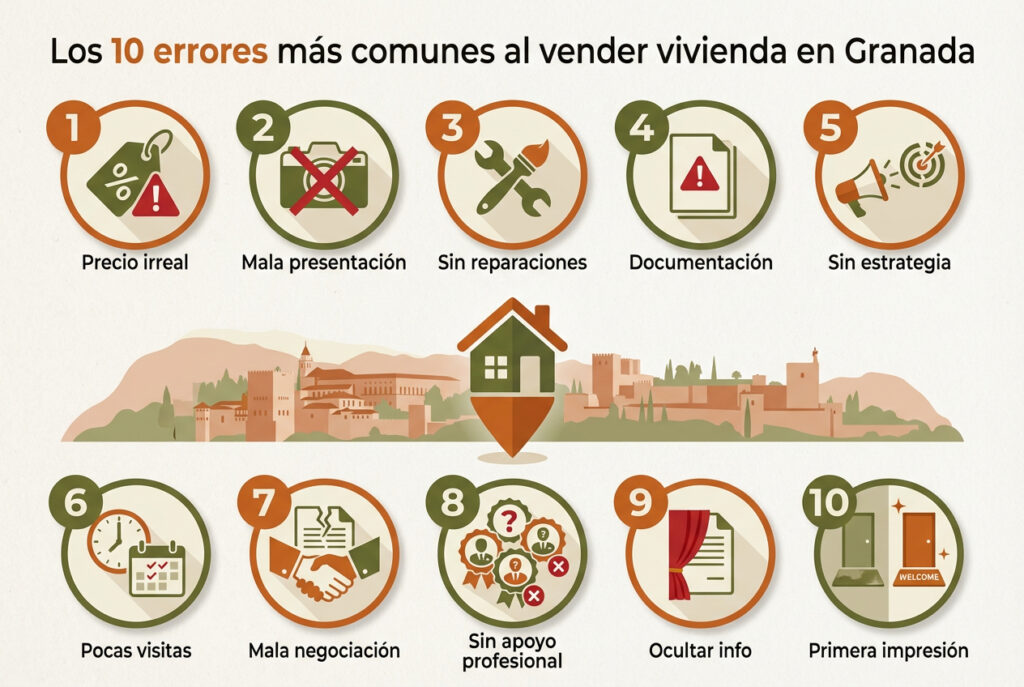 Vender una vivienda en Granada puede ser rápido y rentable si se evita cometer los errores más comunes: poner un precio incorrecto, descuidar la presentación, no tener documentación lista, limitar visitas o negociar sin información. La clave está en preparar una estrategia, actuar con transparencia y apoyarse en profesionales con experiencia.